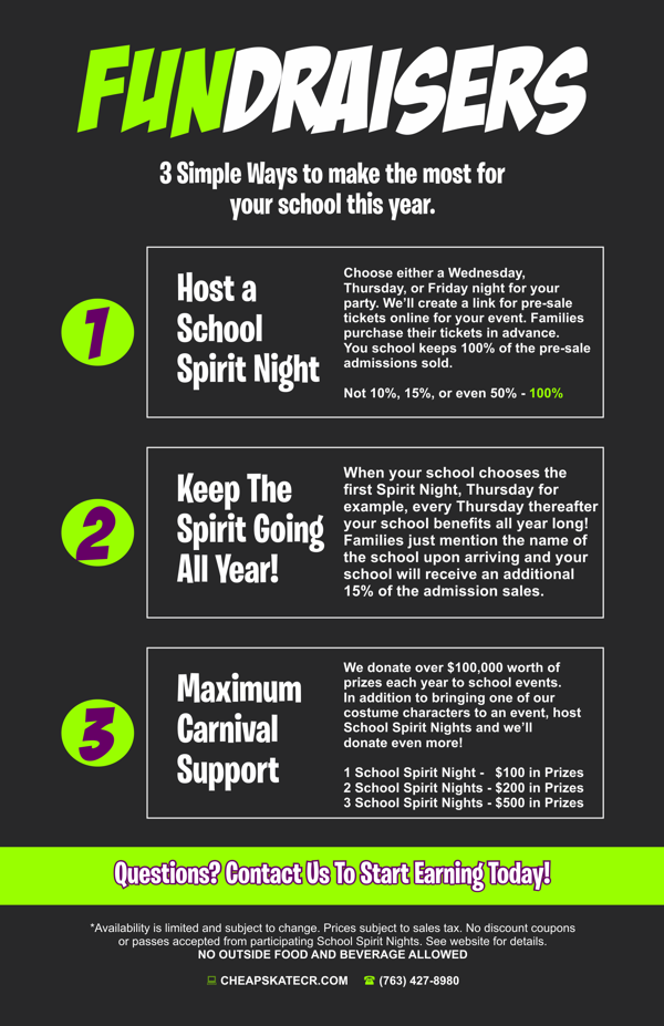 To get started on the best FUNdraising program around, fill out this short form, and we’ll reach out to you. All information submitted to Cheap Skate via this form will be held strictly confidential. It will not be shared or to sold to any third parties. It will remain the property of Cheap Skate.